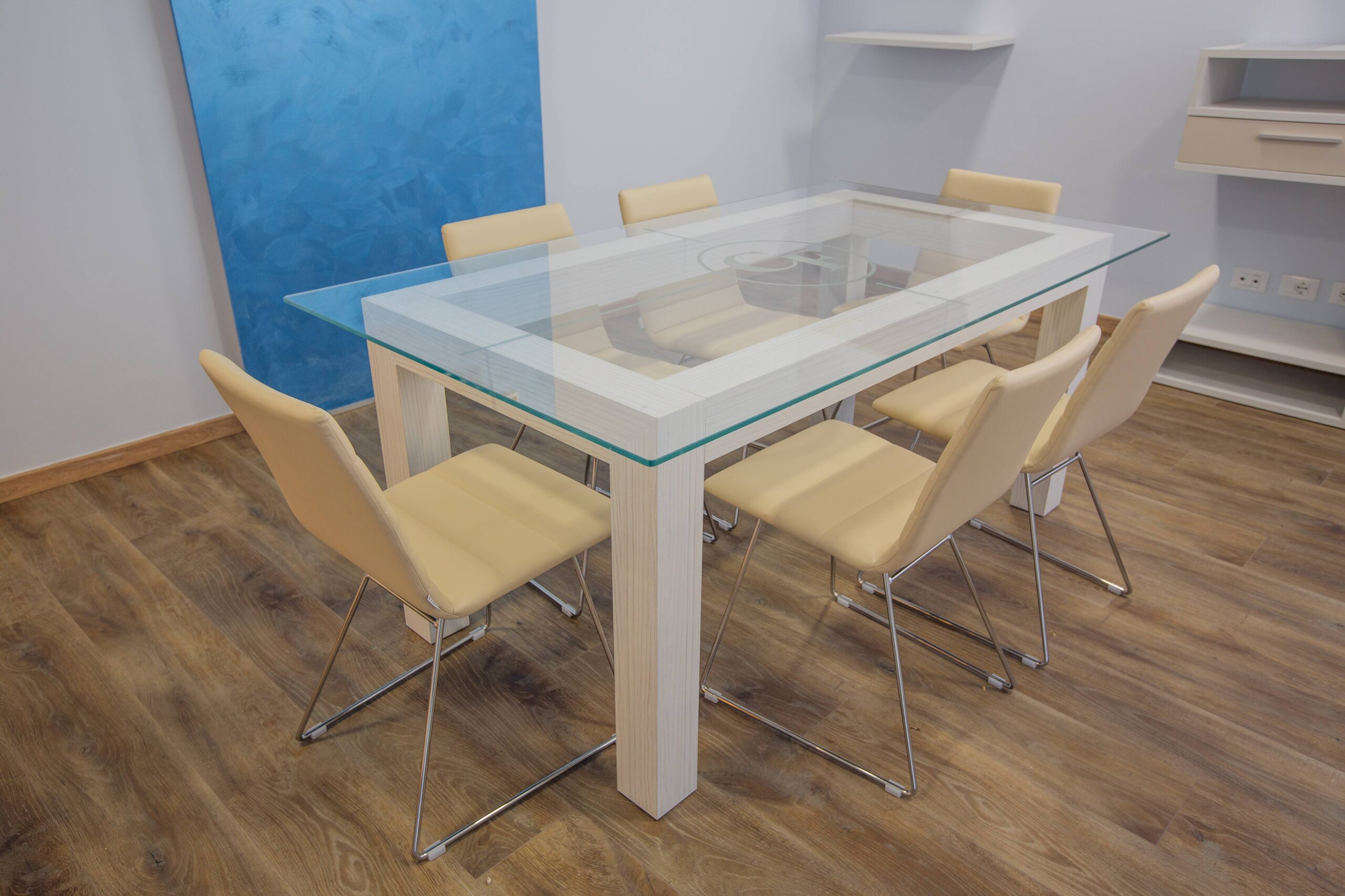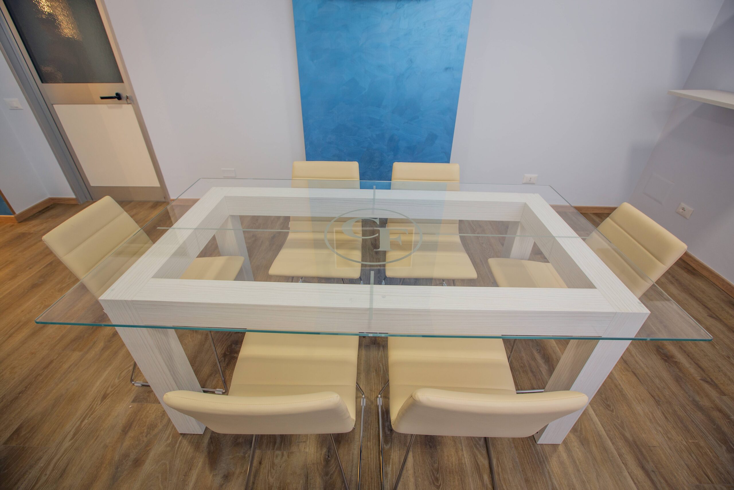 La massima personalizzazione è stata dedicata anche al tavolo realizzato per la sala riunioni: un elegante piano in vetro con stampato il logo aziendale e sorretto da una struttura con la stessa finitura frassino degli arredi, al quale abbiamo abbinato delle sedie in ecopelle.